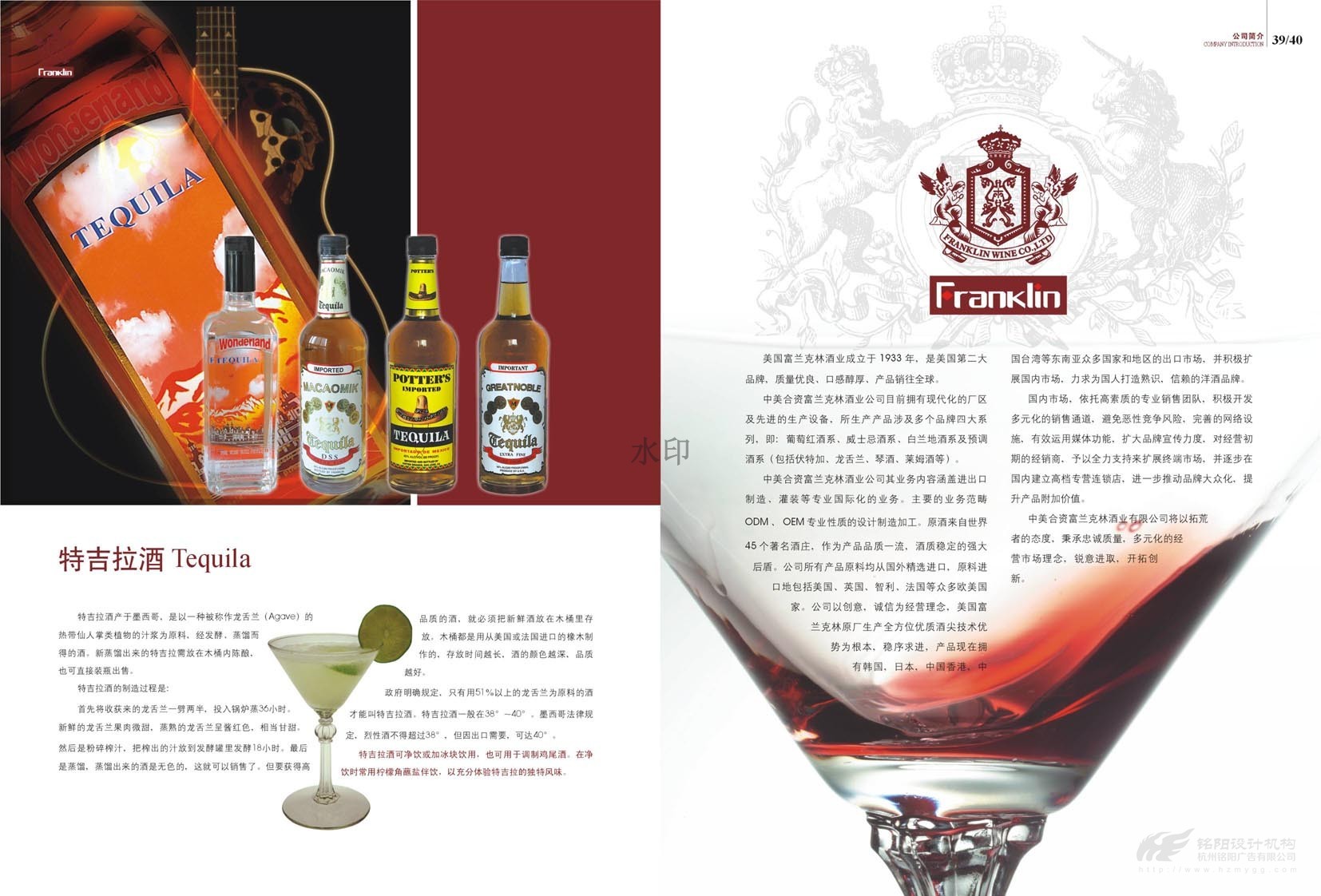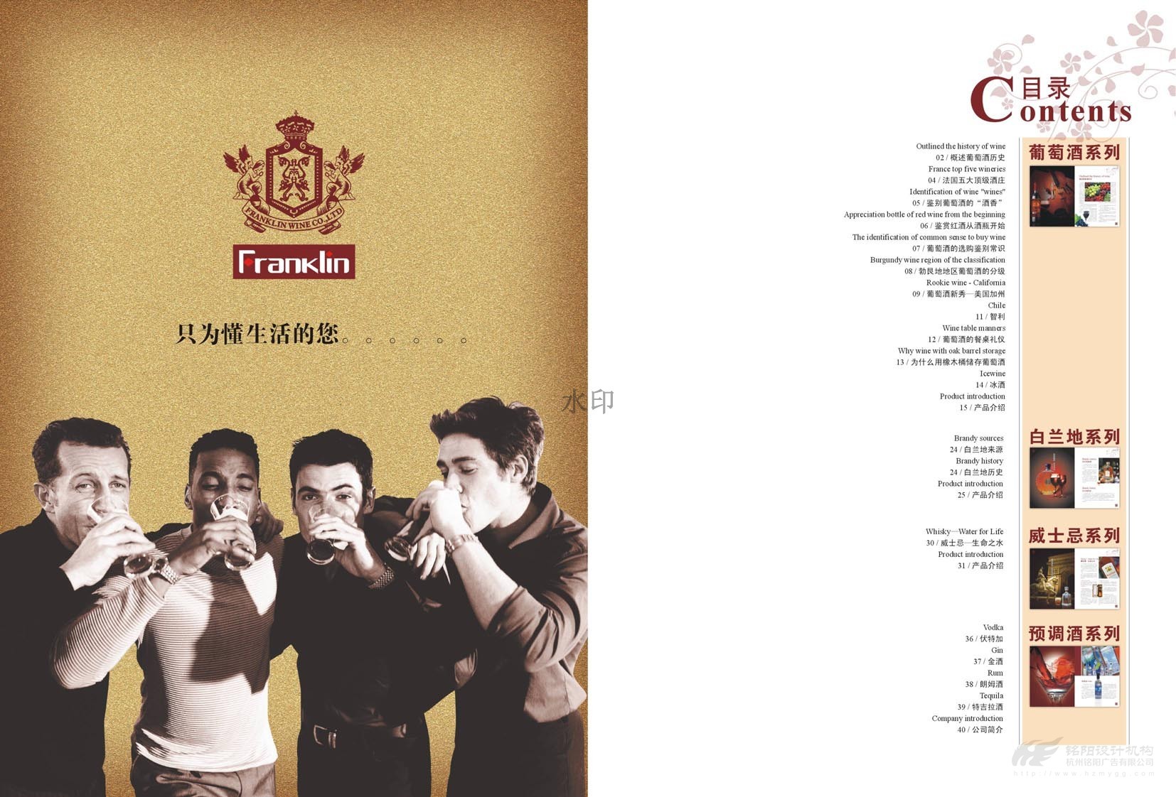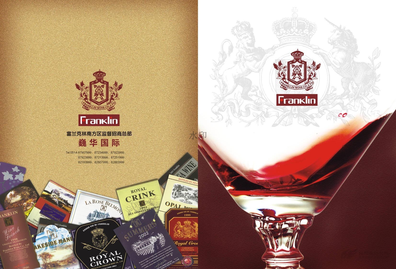 “只為懂生活的您......”,“一次邂逅·此生心傾”。美國富蘭克林酒業(yè)成立于1933年,是美國第二大品牌,宣傳冊設(shè)計概述了葡萄酒歷史,法國五大頂級酒莊,如何鑒別、鑒賞紅酒,葡萄酒的分級及餐桌禮儀等。圖文并茂,精美絕倫,是一本值得收藏的畫冊。