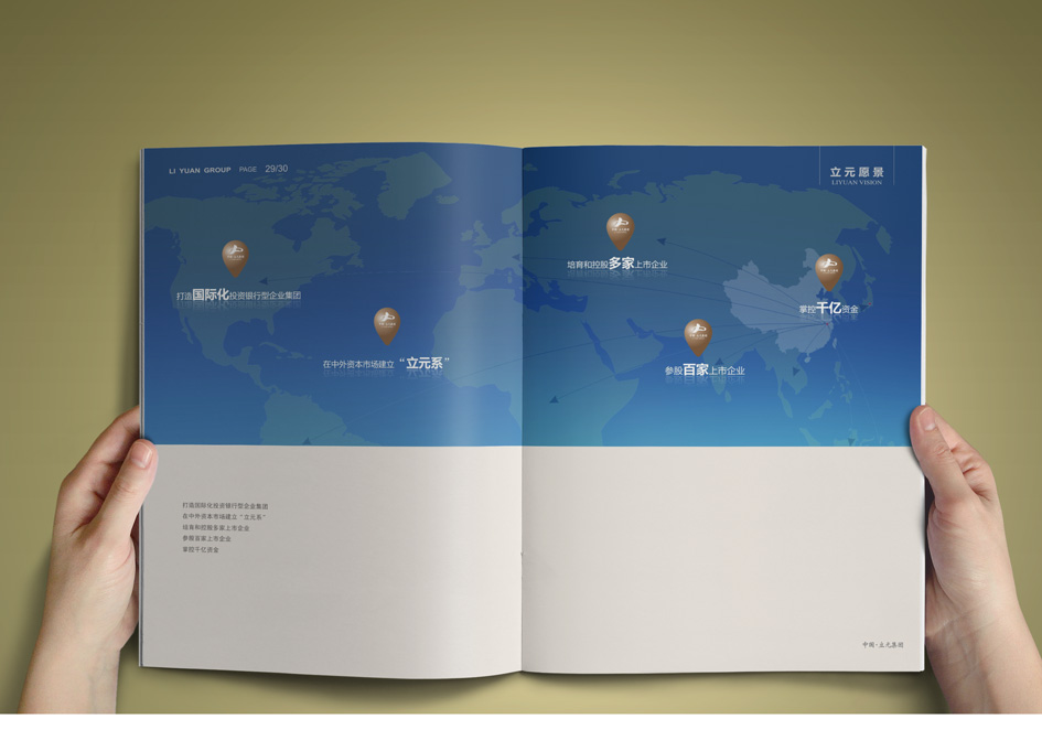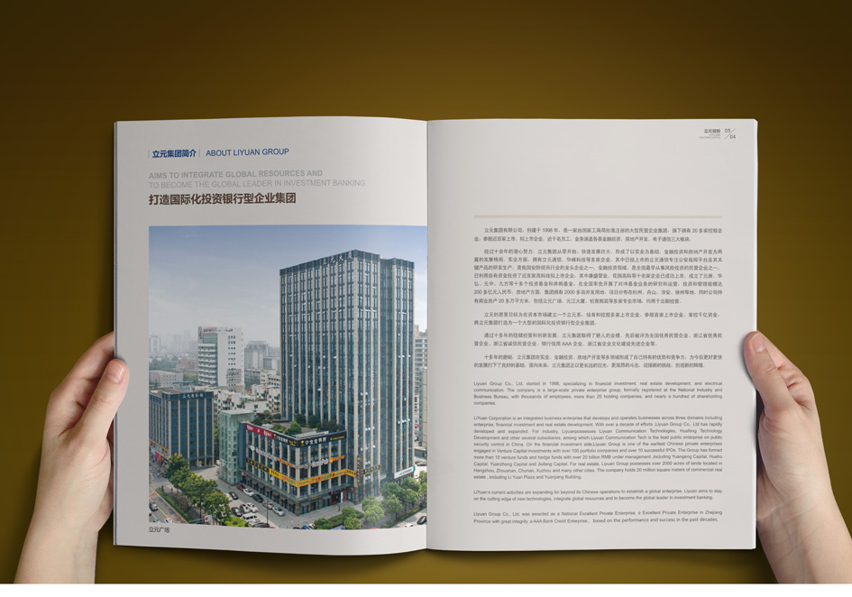 立元集團創(chuàng)建于1998年,旗下?lián)碛?0多家控股企業(yè),參股近百家上市、擬上市企業(yè),近千名員工,業(yè)務涵蓋各類金融投資、房地產(chǎn)開發(fā)、電子通信三大板塊。銘陽廣告公司先后為其提供集團宣傳冊設計、團隊攝影、資本投資畫冊設計、員工手冊設計制作、物業(yè)公司宣傳設計、大型主題會議設計、PPT設計等。